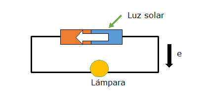 Células fotovoltaicas.- Si una unión PN la conectamos a una lámpara como en la segunda figura y bombardeamos con los fotones de la luz  solar su parte N se producirá una liberación de electrones. Como estos electrones no pueden cruzar la unión PN de derecha a izquierda, tendrán que circular a través de la lámpara hasta alcanzar la unión PN por el otro lado, desde donde serán impulsados hacia la derecha por el campo eléctrico. De esta forma la energía solar se transforma en energía eléctrica.