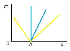 Si una persona está quieta en el punto A, su posición en el espacio será siempre la misma, aunque vaya transcurriendo el tiempo. Por lo tanto, su línea de mundo (que así se llama a su trayectoria) será la línea vertical azul. Si se pone en movimiento su línea de mundo será la línea azul inclinada, que va cambiando de posición a medida que avanza el tiempo. Un rayo de luz hacia adelante o hacia atrás se desplazará como las líneas amarillas, formando un ángulo de 45º con el eje horizontal, pues en ellas cualquier intervalo de espacio x es igual al intervalo correspondiente en el eje del tiempo, puesto que siendo c la velocidad de la luz, ct=x. Como nada se puede mover a mayor velocidad que la de la luz, la línea inclinada azul nunca alcanzará la posición de la amarilla que hay a su derecha.