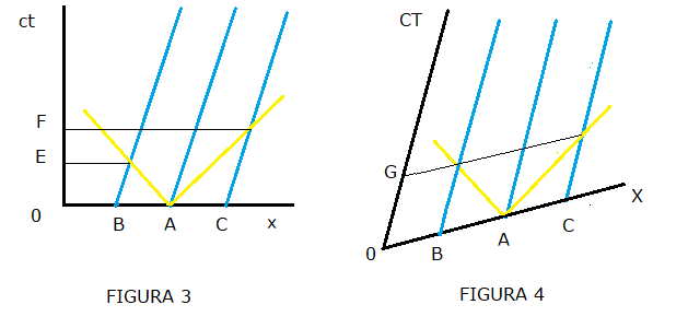 Sin embargo, si este mismo suceso, definido por las líneas azules y amarillas, en vez de verlo desde los ejes ct-x de la figura 3 lo vemos desde los ejes CT-X de la figura 4, los dos rayos de luz alcanzan a B y C de forma simultánea, porque tienen lugar en el mismo instante, que es el punto G del eje de tiempos.