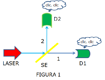 Cuando lanzamos fotones desde el laser van llegando indistintamente a los dos detectores, según tomen los caminos 1 0 2, que los van recibiendo con sus sonidos intermitentes, clic, clic, clic. Observando lo que va sucediendo se puede afirmar lo siguiente: