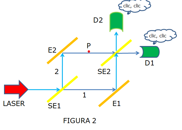 -Si el recorrido 1 está interrumpido mediante un objeto que impida que el fotón pueda ir desde el semiespejo SE1 al espejo E1, los dos detectores D1 y D2 harán clic, clic, clic. El comportamiento del fotón depende por lo tanto de que haya o no un objeto abajo interceptando el camino desde SE1 a E1. Pero eso supone que el fotón tiene que tener algo que se lo diga. Cuando el fotón está en P, camino de SE2, ¿cómo puede saber si hay o no un objeto interceptando la trayectoria de abajo?
