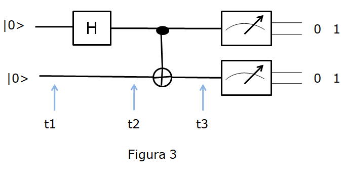 Para pasar de t2 a t3 nos encontramos con una puerta CNOT, en la cual, como vemos en la figura 1, el grupo |0>1|0>2 que son las entradas de arriba se queda igual y el |1>1|0>2 se transforma en |1>1|1>2, quedando por lo tanto la situación global como: