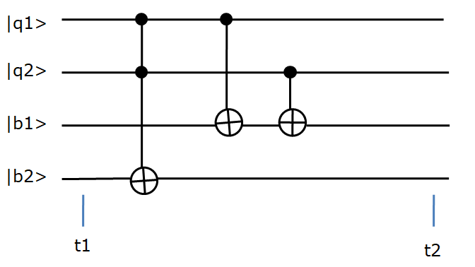 Puerta CCNOT.- Se trata de una ampliación para tres cúbits de la puerta CNOT, con dos cúbit de control y un cúbit objetivo Su circuito lógico es el de la figura 1.1