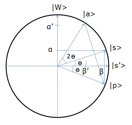 Como vemos, el ángulo que ahora forman |a> y |s> es 2θ, lo que quiere decir que nos vamos acercando al eje vertical. Cuando después de muchas iteraciones el valor inicial de θ siga creciendo, llegará un momento en el que el correspondiente vector |a> se identificará con el vector |W>, entonces el valor de la correspondiente α’ será uno, y si la probabilidad de haber alcanzado |W> es igual a uno quiere decir que ese es el valor que estábamos buscando.