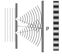 En ella, un frente de luz incide desde la izquierda sobre una superficie opaca con dos rendijas. Al salir de cada una de las rendijas, por su naturaleza ondulatoria, la luz se propaga como se ve en la figura, y si a continuación se interpone una pantalla P se obtiene un espectro de líneas blancas y negras debido a la interferencia de las dos ondas, según lleguen en fase, o en oposición como muestra la figura 2. Este experimento puso de relieve la naturaleza ondulatoria de la luz, y esta técnica para el estudio de las ondas, llamada interferometría, se sigue utilizando en la actualidad con gran precisión sin que haya sido superada por ninguna otra.