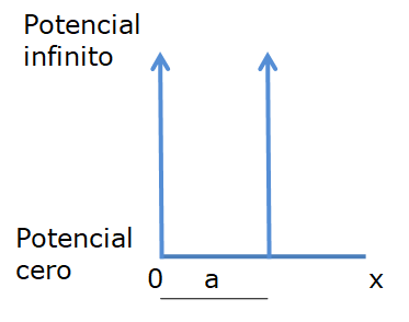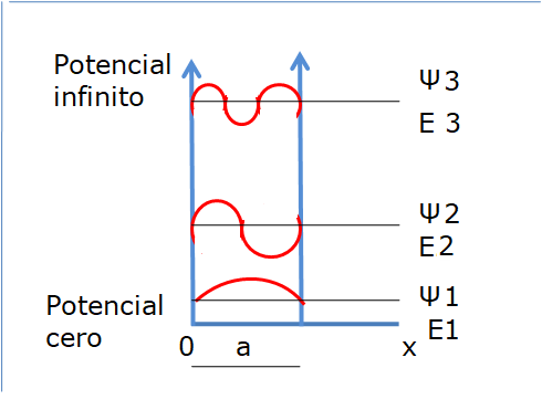 Supongamos que tenemos una partícula de masa m en un pozo de potencial de anchura «a» como el de la figura1, del cual no puede salir porque las barreras que lo delimitan tienen un potencial de valor infinito que la partícula no puede superar. Para saber que ocurre con la partícula aplicamos la ecuación de onda de Schrödinger, que es una ecuación diferencial que nos da las siguientes soluciones para la propia función de onda y para la energía de la partícula: