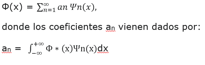 Vemos pues que el sistema queda definido por un vector de estado, Φ(x), de n o infinitas dimensiones, en un espacio de Hilbert, cuya base está formada por los distintos valores de Ψn, con respecto a la cual las componentes de Φ, an, serán los productos internos de Φ por cada uno de los elementos de esta base, que es lo que expresa la fórmula (2)