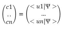 Donde <u1|Ψ> es el producto escalar de u1 y Ψ y <u2|Ψ> es el producto escalar de u2 y Ψ. El paralelismo entre los vectores y el carácter vectorial de los estados cuánticos en el espcio de Hilber es evidente.