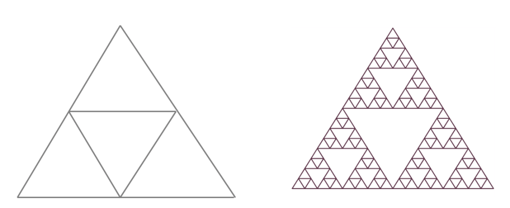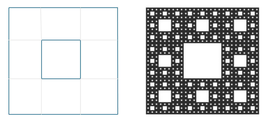 En el mundo científico los fractales más utilizados son el triángulo y el cuadrado de Sierpinski. El primero se forma tomando un triángulo equilátero con un vértice hacia arriba y dibujando en su interior un triángulo invertido como se ve en la figura 1a. El fractal surge si repetimos esta misma operación en cada triángulo que veamos con un vértice hacia arriba dentro del triángulo primero, como se indica en la figura 1b, repitiendo el proceso hasta el infinito. El cuadrado de Sierpinski se forma de manera similar pero partiendo de un cuadrado en lugar de un triángulo como se representa en las figuras 2a y 2b.